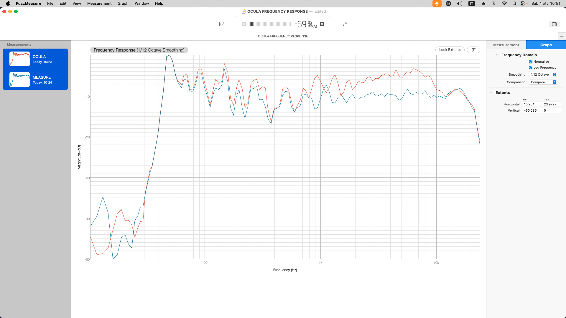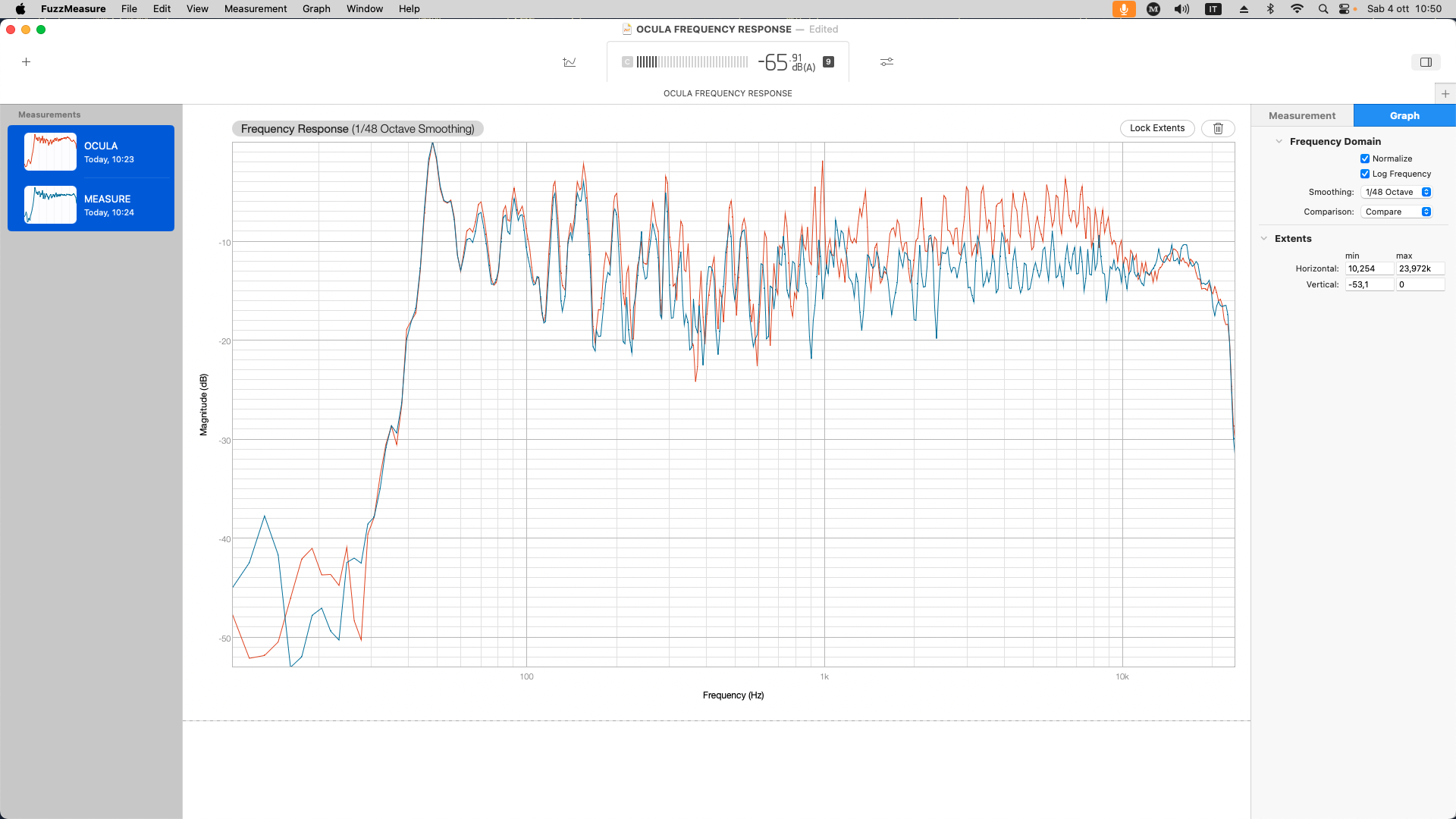 What happens under 50Hz is not relevant in this environment because the speaker is unable to generate sound down there. Recording an ambience sound reveals that the OCULA, like the MBNM 550 is well sensitive and full down to the spectrum starting point.