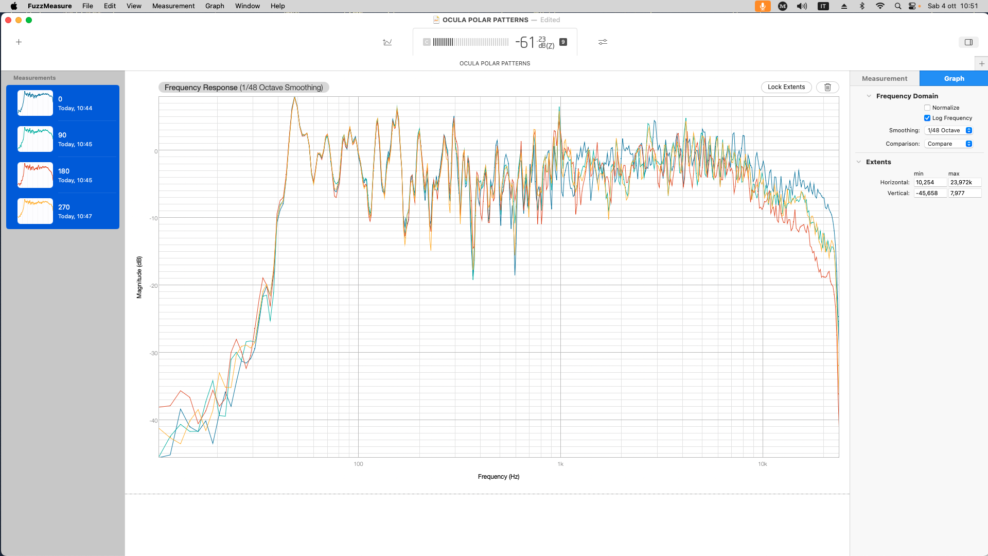 Instead of the classic polar chart which is pretty hard for me to plot i am presenting the OCULA polar response on 4 axis, which is very informative with respect to the microphone behavior vs. the sound incidence axis, and it’s just another way to graphically plot the polar pattern concept.